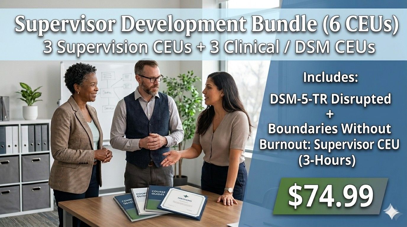 This bundle includes two separate CEU trainings, each approved by the Alabama Board of Social Work Examiners. Combined, they fulfill the 3-hour DSM-5-TR and 3-hour Supervision requirement for Clinical Social Workers in Alabama and offer a total of 6 CEU hours.